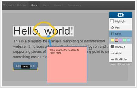 Usersnap按鈕添加一個(gè)反饋?lái)?xiàng)目的web頁(yè)面。當(dāng)單擊按鈕時(shí),就會(huì)出現(xiàn)一個(gè)框有不同的評(píng)論工具。除了一個(gè)箭頭工具和鋼筆工具,幫助用戶(hù)在web頁(yè)面上留下反饋,像素標(biāo)尺工具方便時(shí)候討論的東西需要轉(zhuǎn)一些像素向上或向下或如果商標(biāo)需要更大。