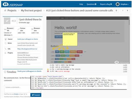 Usersnap根據(jù)其網(wǎng)站“每個(gè)人都在一個(gè)web bug報(bào)告項(xiàng)目”。讓Usersnap工作在你的項(xiàng)目很簡(jiǎn)單:您可以復(fù)制粘貼一個(gè)JavaScript片段bug報(bào)告工具將提供您,或者您的用戶(hù)可以安裝Chrome擴(kuò)展或火狐插件。
