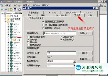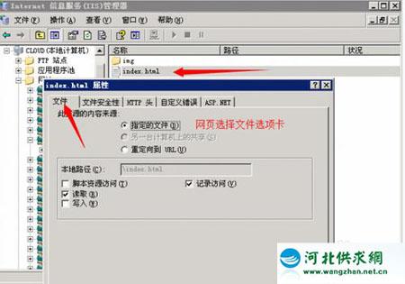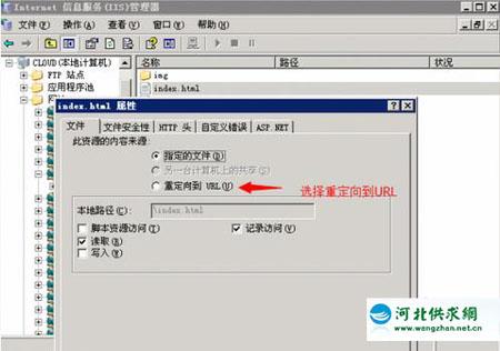 打開IIS,找到要重定向的網(wǎng)站或者網(wǎng)頁,右鍵查看屬性,如果是網(wǎng)站則選擇主目錄選項(xiàng)卡,網(wǎng)頁則是文件選項(xiàng)卡。如下圖所示: