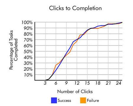 如果有一個(gè)科學(xué)依據(jù)設(shè)定“三次點(diǎn)擊”的原則,我們找不到它在我們的數(shù)據(jù)。我們的分析使我們沒有任何用戶點(diǎn)擊的次數(shù)之間的關(guān)系和他們的成功找到他們尋找的內(nèi)容。我們的分析表明,沒有任何用戶退出三點(diǎn)擊后的可能性比12點(diǎn)擊。當(dāng)我們成功的任務(wù)不成功的人相比,我們沒有發(fā)現(xiàn)差異分布的任務(wù)的長度。幾乎沒有人放棄了后三個(gè)點(diǎn)擊。