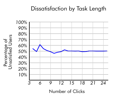 如果我們看的任務(wù)大大超過三次點(diǎn)擊,我們看到用戶的滿意度下降了嗎?結(jié)束時(shí)的620個(gè)任務(wù),我們要求用戶如何滿足他們的網(wǎng)站的任務(wù)。再次,有各種各樣的答案,有時(shí)用戶非常滿意,其他時(shí)候他們完全不滿意。這些評(píng)級(jí)與點(diǎn)擊的數(shù)量了嗎?分析滿意度的數(shù)據(jù)后,我們?nèi)匀粵]有發(fā)現(xiàn)證據(jù)的設(shè)定“三次點(diǎn)擊”的原則。當(dāng)我們看著用戶不滿意的比例,我們的數(shù)據(jù)顯示幾乎沒有變化之間不同的點(diǎn)擊流長度。更少的點(diǎn)擊不讓用戶更滿意。